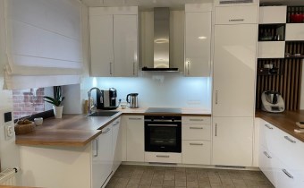 Kuchnia jasna z nowymi meblami w zabudowie.